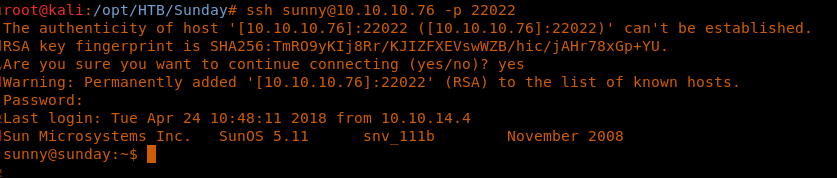 Ssh sunny@10.10.10.76 -p 22022
