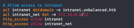- Looking into the squid.conf, we get some interesting information about the intranet domain and password.