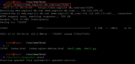 As can be seen above, we downloaded the exploit on our attacker machine using the wget utility. The exploit was downloaded as '15285' in the 'var/www/html' directory on our attacker machine. We started the apache service as we will now transfer the exploit from our attacker machine to the target machine with the help of a downloadable URL.