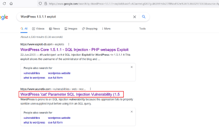 As can be seen above, the identified WordPress version is vulnerable to SQL injection vulnerability. There is a working exploit available on the exploit-DB website. So, we tried to execute it, but it did not work. Then, we found the parameter name which was vulnerable for SQL injection. Let us verify it on the target machine.