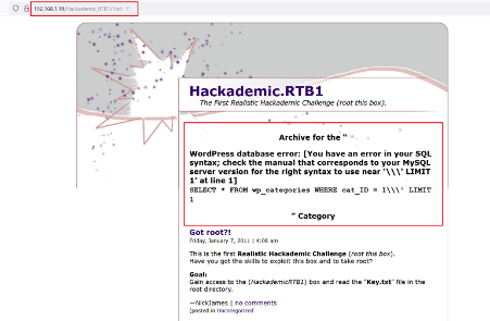 Command used: << sqlmap -u http://192.168.1.19/Hackademic_RTB1/?cat=1 >>