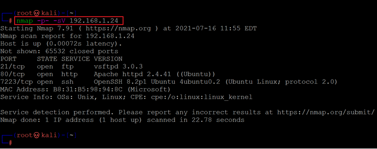 Command used: << nmap -p- -sV 192.168.1.24 >>