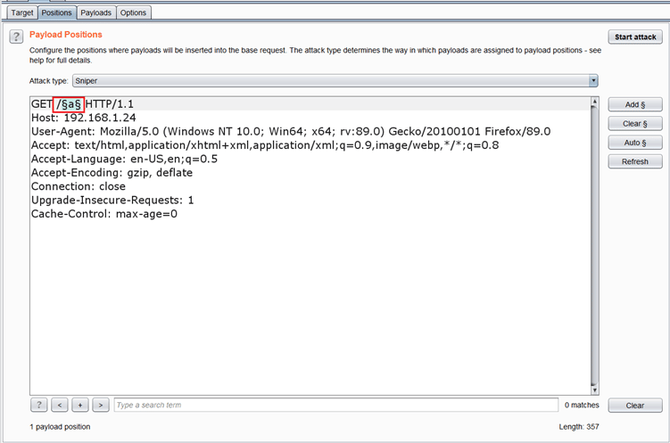 In this step, we will use Burpsuite to conduct a URL brute force attack against the target application using the identified wordlist. For this, we opened the burp intruder and configured the URL as a brute-forcing parameter; this can be seen below.