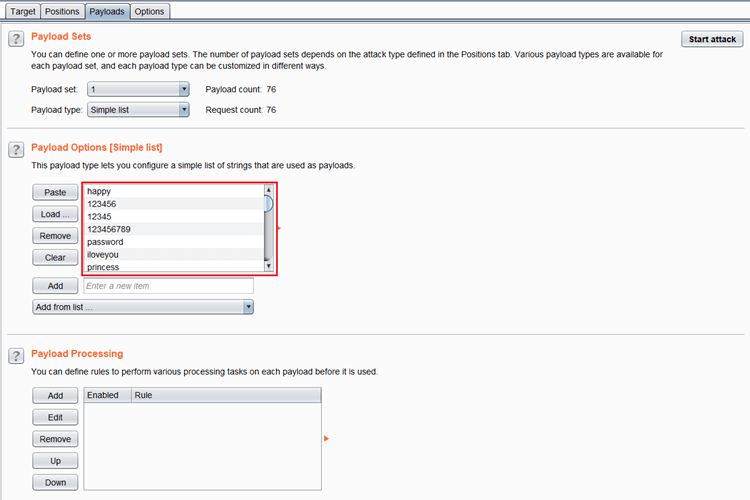 We clicked on the payload to configure the settings. In the payload options section, we pasted the wordlist contents as identified in the previous steps. Now, let’s execute the attack by clicking on the start attack option. The results can be seen below.