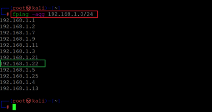 Command used: << fping -aqg 192.168.1.0/24 >>