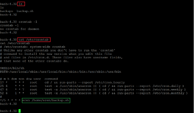The backup.sh file could be updated by user eren as we have the user bash privilege. We used the echo command to update the backup.sh file with another reverse proxy payload. Also, on our attacker machine, we configured netcat to listen to incoming connections through port 3434.