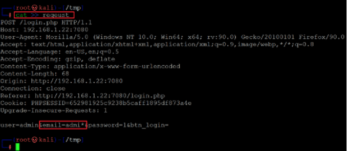 SQLMAP is one of the best open-source tools to exploit SQL Injection vulnerability, and it is installed in Kali Linux by default. We copied the login post request from Burp Suite and pasted it into a note file on our attacker machine, seen below.