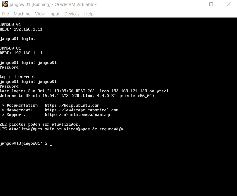 As can be seen in the highlighted area of the above screenshot, we found a username in the 'jangow01'. As we do not have the SSH port open, we cannot attempt to brute force into the SSH service. However, when we started the target machine into the virtual box, we had a login screen. So, let us try to log in on the virtual machine login screen, which is seen below.