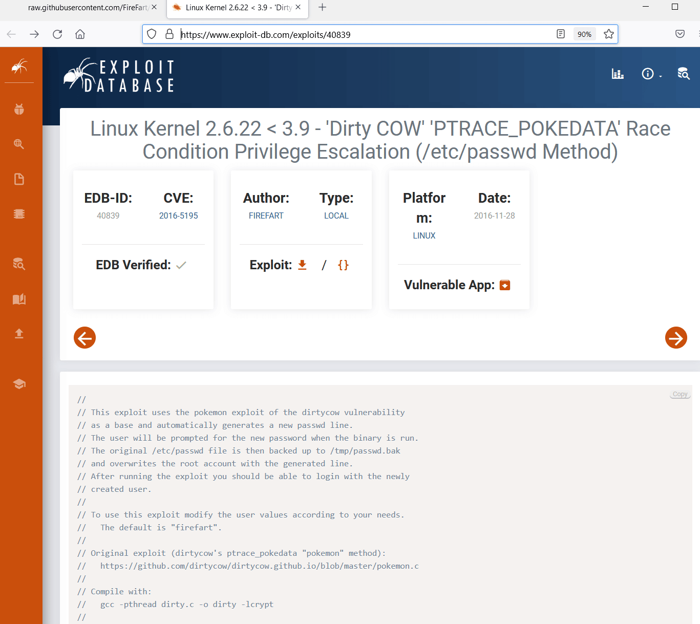 We got known that our target machine is running a vulnerable version of Kernel and the exploit is also available on the Exploit-DB website. After reading the exploit process on the website, we downloaded the exploit on the attacker's machine for further configurations.