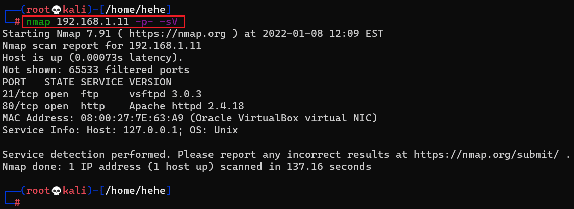 Command used: << nmap 192.168.1.11 -p- -sV >>