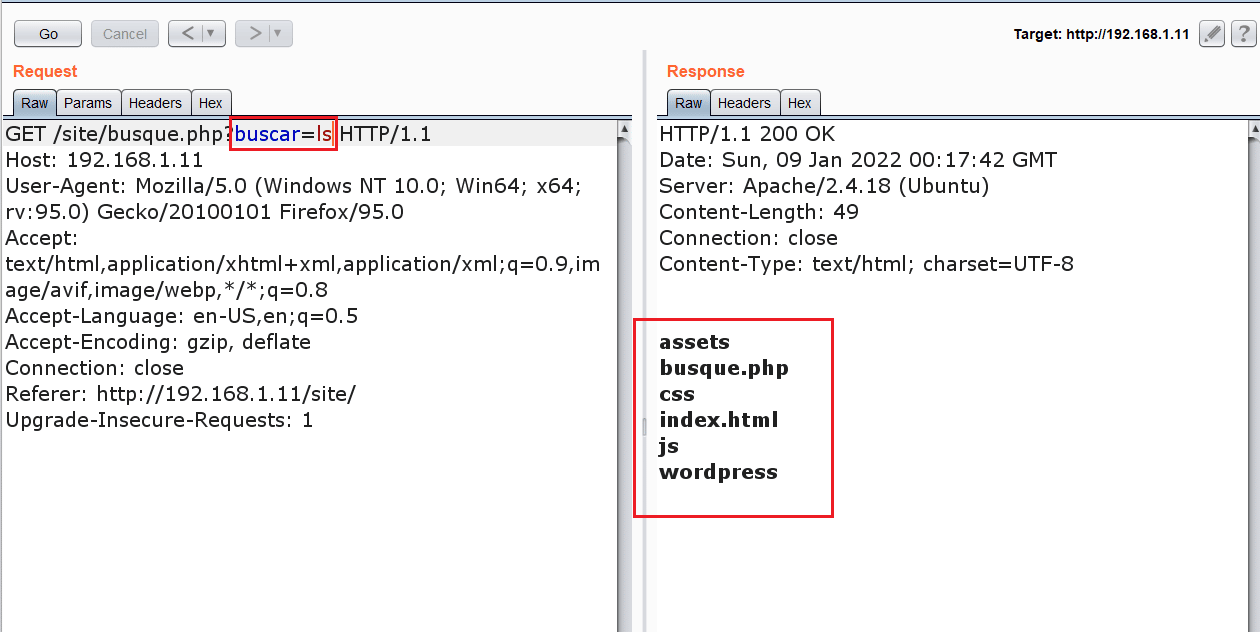 We found that a WordPress application is being run through this folder. The application seems to be under construction which increases the possibilities of finding vulnerable code. While exploring the web application, we found an interesting file with a get parameter named 'buscar.' So, we decided to analyze the request further. We opened the Burp Suite and intercepted the request in the burp repeater, which can be seen in the following screenshot.