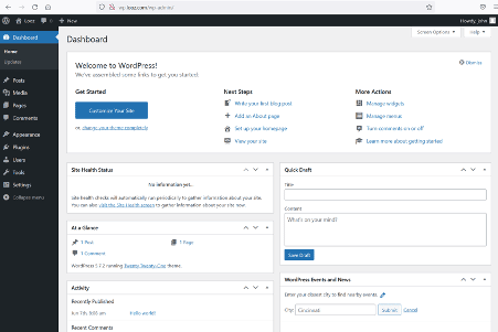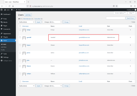 The login was successful, and now we are logged into the WordPress admin panel as user john. Let's check the current user privilege.
