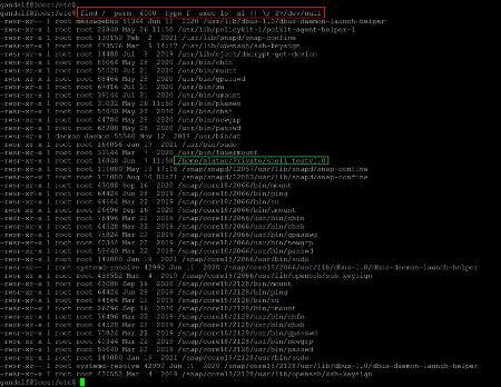 We continued checking and analyzing configurations on the target machine and explored various files and folders for further clues. During this process, when we checked the SUID binaries, we found an interesting binary which can be seen in the following screenshot.