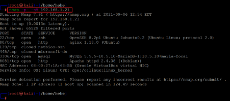 Command used: << nmap -sV -p- 192.168.1.21 >>