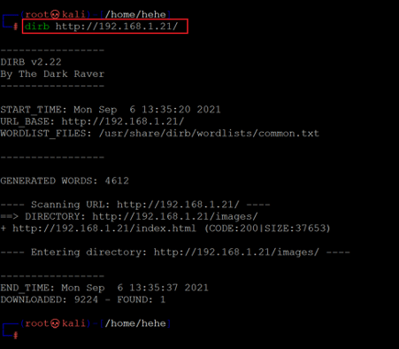Command used: << dirb http://192.168.1.21/ >>