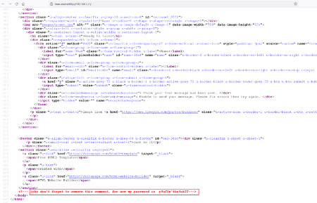 The Dirb scan could not generate any interesting information in the output. So, we started analyzing the HTML source code of the target application homepage. We found something interesting hidden in the comments, as seen in the screenshot given below.