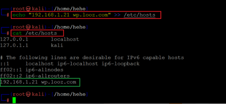In the above screenshot, first, we have added the hostname "wp.looz.com" into the hostfile '/etc/hosts' with the help of the echo command. Then we verified the change by opening the host's file, and the output confirms that the target machine host has been added.