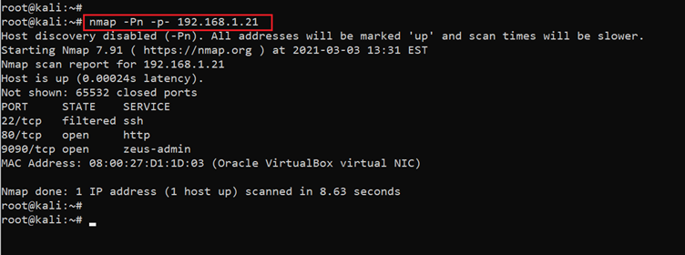 Command used: << nmap -Pn -p- 192.168.1.21 >>