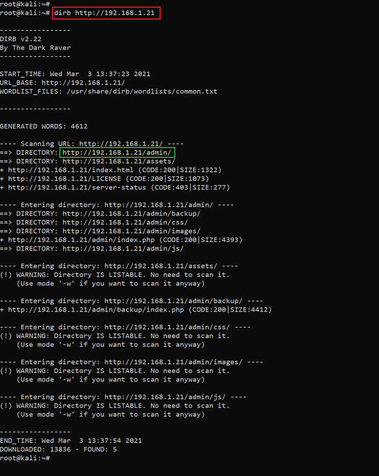 Command used: << dirb http://192.168.1.21 >>