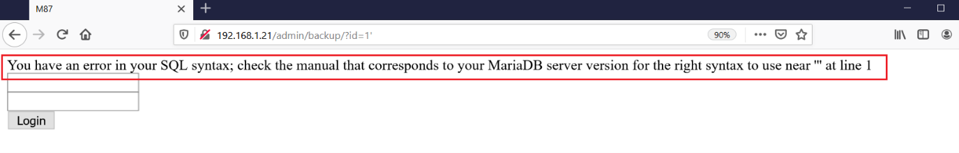 As we can see above, we found another login page. As before, I tried a few default credentials and explored ways to find other vulnerabilities such as SQL injection, but nothing seemed to be working. At this point, I recalled that the author has given "fuzzing" as a hint. So, I performed parameter fuzzing on this page and found the "id" parameter was vulnerable to SQL injection. We can see the SQL injection error in the below screenshot, which confirmed that the parameter is vulnerable.
