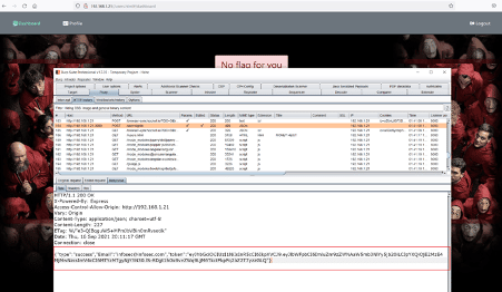 After being logged into the application on the dashboard, we got a message that there are no flags for non-admin accounts. Since we are not admin, we cannot access the flag. We started analyzing the target application through Burp suite proxy, as seen below.