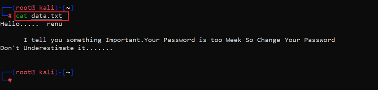 The secret key successfully worked as the command was successful. The tool extracted all the information from the image file and saved it in the "data.txt" file. Let us open the file with the help of the "cat" command which can be seen in the following screenshot.