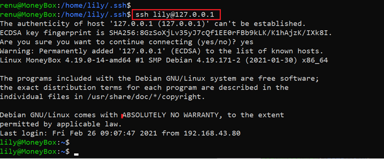 Command used: << ssh lily@127.0.0.1 >>