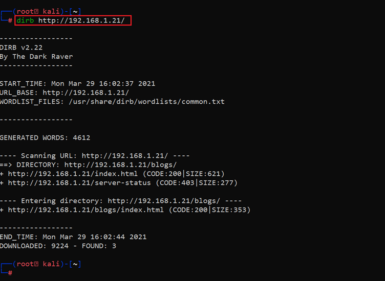 Command used: << dirb http://192.168.1.21 >>