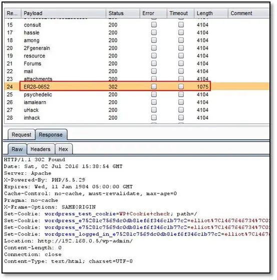 After finding the valid username now we have to brute force it for password on the login page. We used burp intruder with fsocity.dic file and we found the password from the word list.