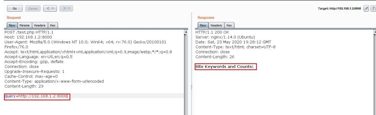 In this step, I am using the Burp Suite tool for intercepting the requests; you can use any intercepting proxy that you are comfortable with. I started by checking the “test.php” file. This can be seen in the highlighted area of the following screenshot.