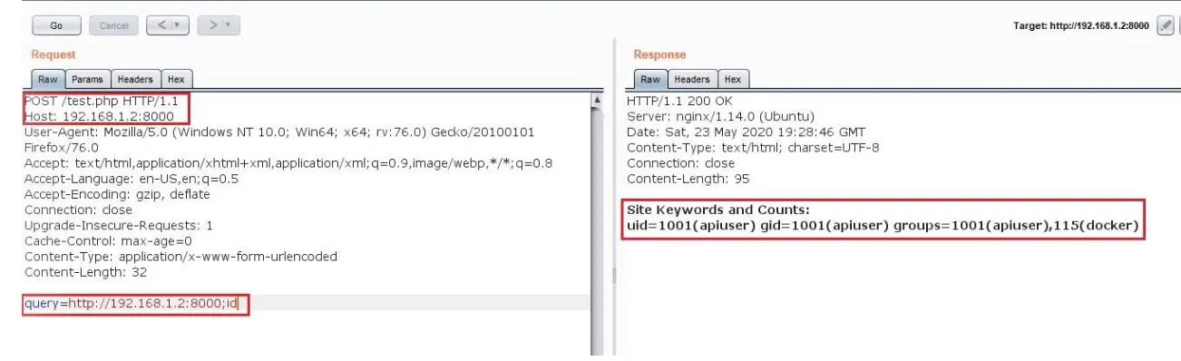 As we can see, when we provided “id” as the parameter value, it showed the current user on the target machine. This means that the query parameter is vulnerable for command execution. In the next step, let’s try to utilize this weakness to our advantage.