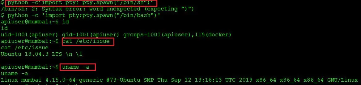 In the previous step, we got the shell access to “apiuser”, but it was the limited shell and our target is to take the root access of the target machine. So, I ran another Python command which gives us the stable shell access. After that, I enumerated the kernel version and operating system version of the target machine. This can be seen in the screenshot given below: