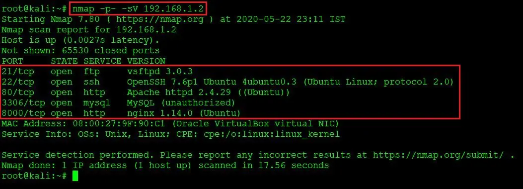 You can see that this time, we used the –p- option with Nmap. It is used for a full port scanning and is the most common Nmap switch. After running the command, the tool will do most of the things by itself. In the above screenshot, we can see a large output generated by the Nmap scan. The summary of the scan is given below.