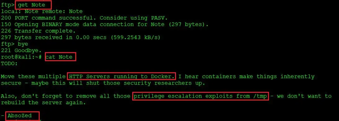 The above screenshot shows that we are able to log into the target machine with FTP default credentials. After that, I ran the ls command, which shows a file named “Note” available in the current directory. Let’s download this file from the target machine into our attacker machine and do some further analysis.