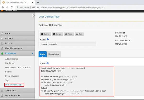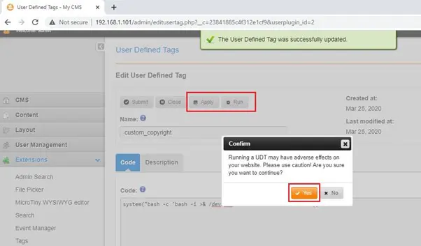 While looking around in website, we have checked various functionalities and options, but we didn’t get any useful information. After spending some more time, we found an option which could be utilized for our goal. In the extensions tab, there was an option named “User Defined Tags” which allows admin user to make code-level changes in the application. We will delete this code and replace it with a shell script to get access of the target machine.