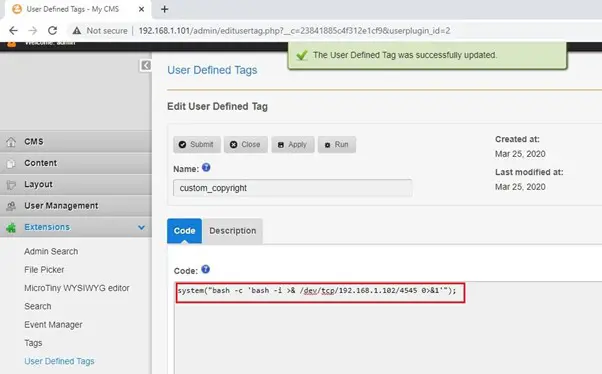 We will enter this reverse shell command in “User Defined Tags” and execute this to get the access of the target machine. The added shell command can be seen in the following screenshot: