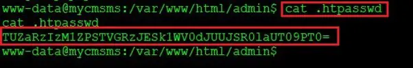 In the above screenshot, we can see the .htpasswd file, the file contains a password which is encoded. By looking at the password string, it seems that the encoding used is base64 format. Let us use an online utility to decode the password. This can be seen in the following screenshot: