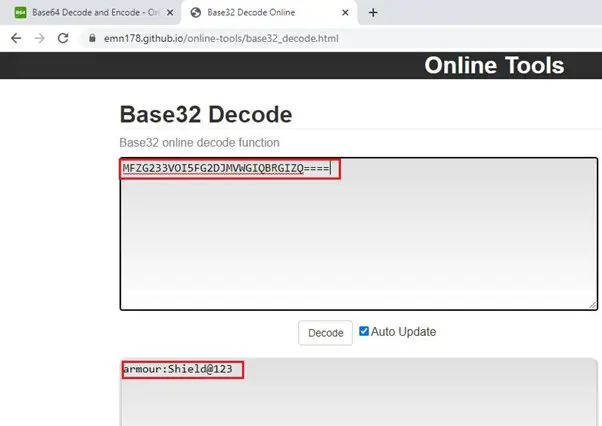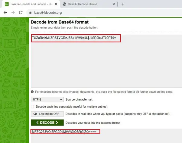 In the above screenshot, we can see that the password string has been decoded by the base64 decoder. But the resulted string is again encoded. This time, it seems that it is encoded using base32 format. So, let’s change the decoder format and try again. This time we changed the decoder format to base32. The output can be seen in the screenshot given below: